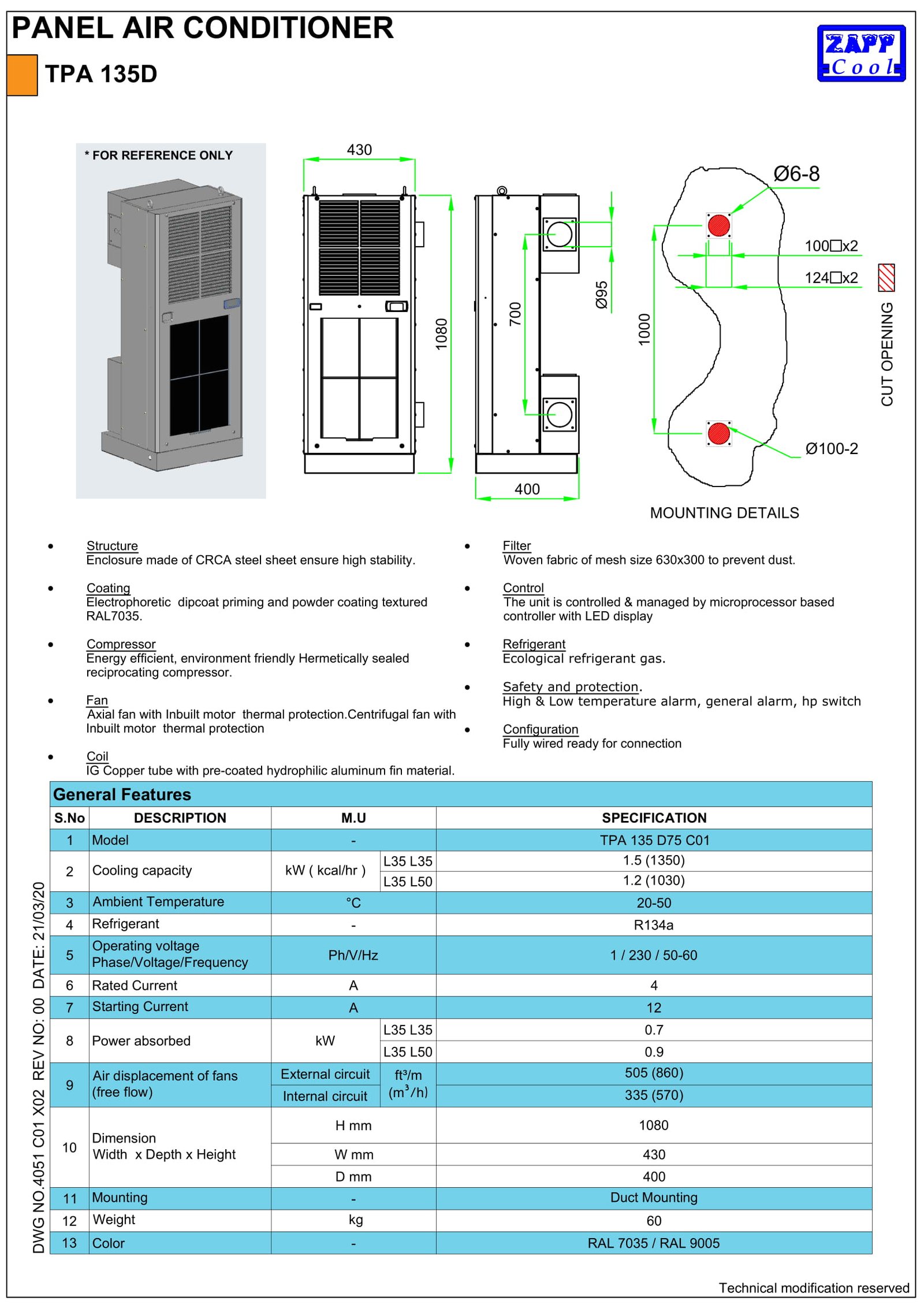 | 700 | 1050 | 1500 | 2300 | 3500 | 5250 | 7000 | Cooling Capacity (W) |